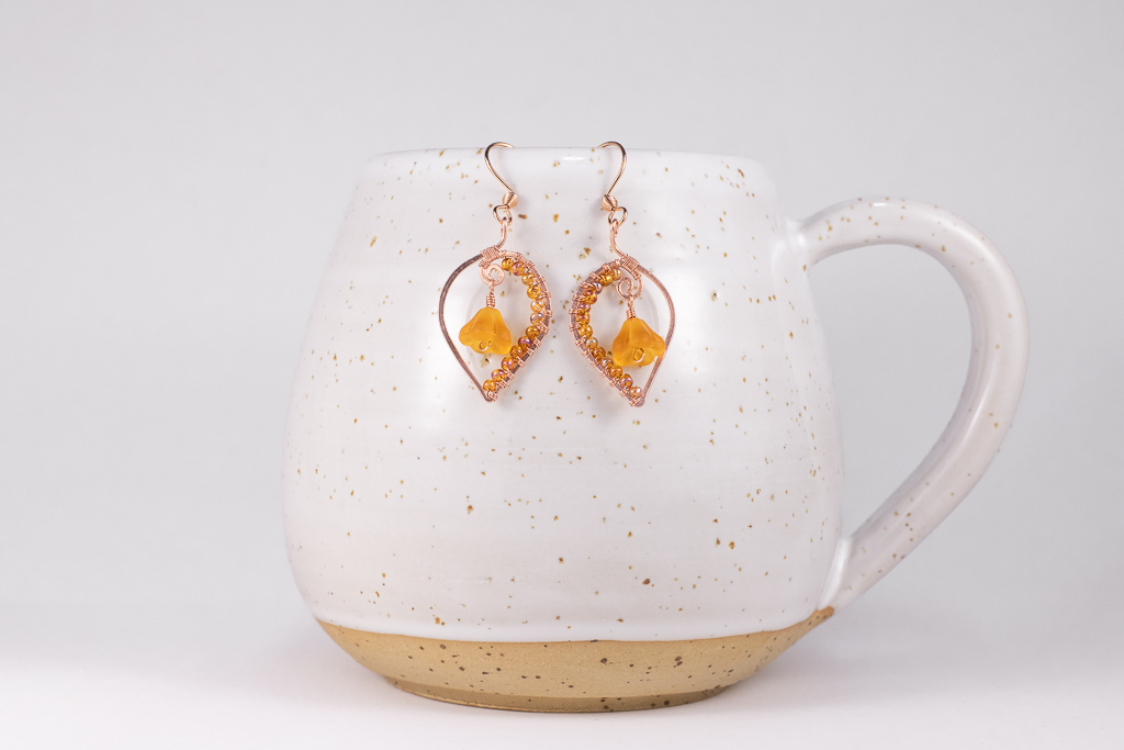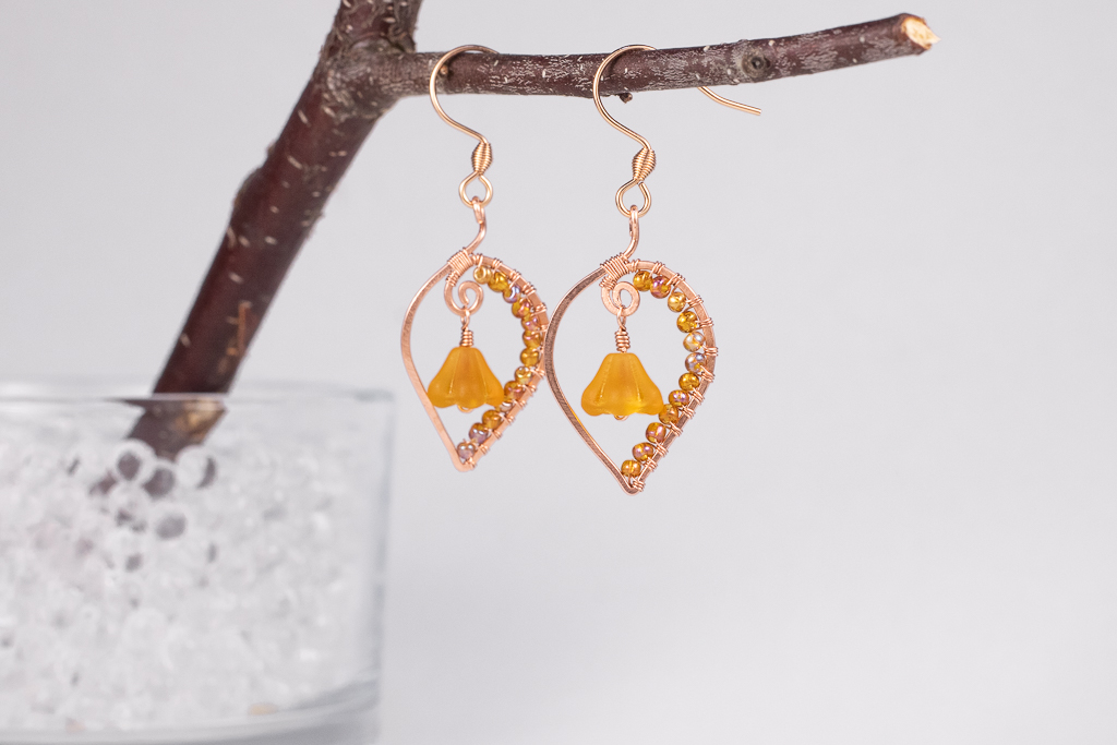 Käsintehdyt korvakorut kuparilangasta, koristeltu oransseilla lasihelmillä.