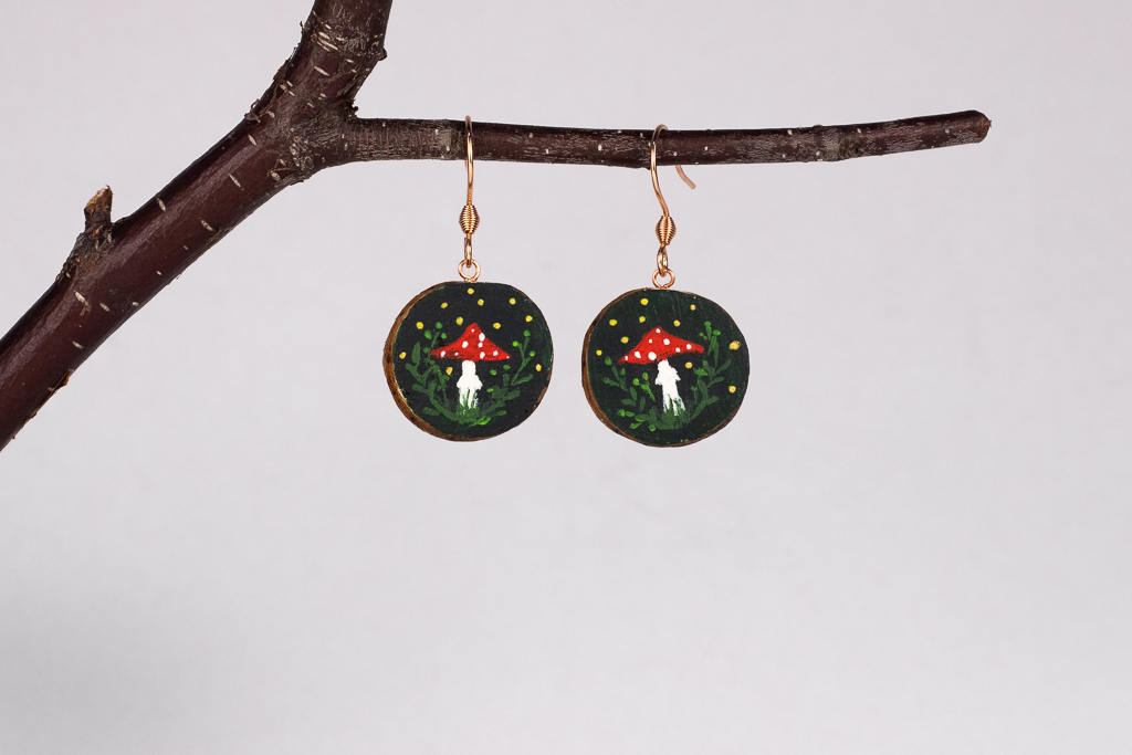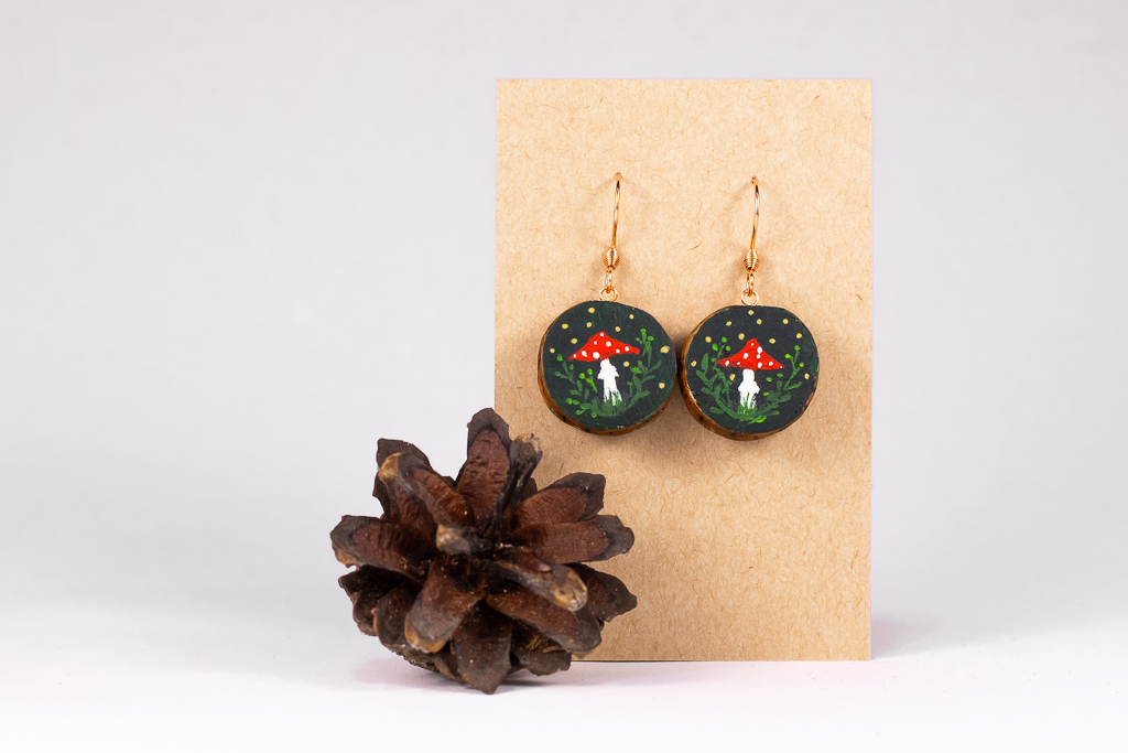 Käsinmaalatut korvakorut mäntypuusta. Puu on omasta metsästä, kaatuneesta puusta.