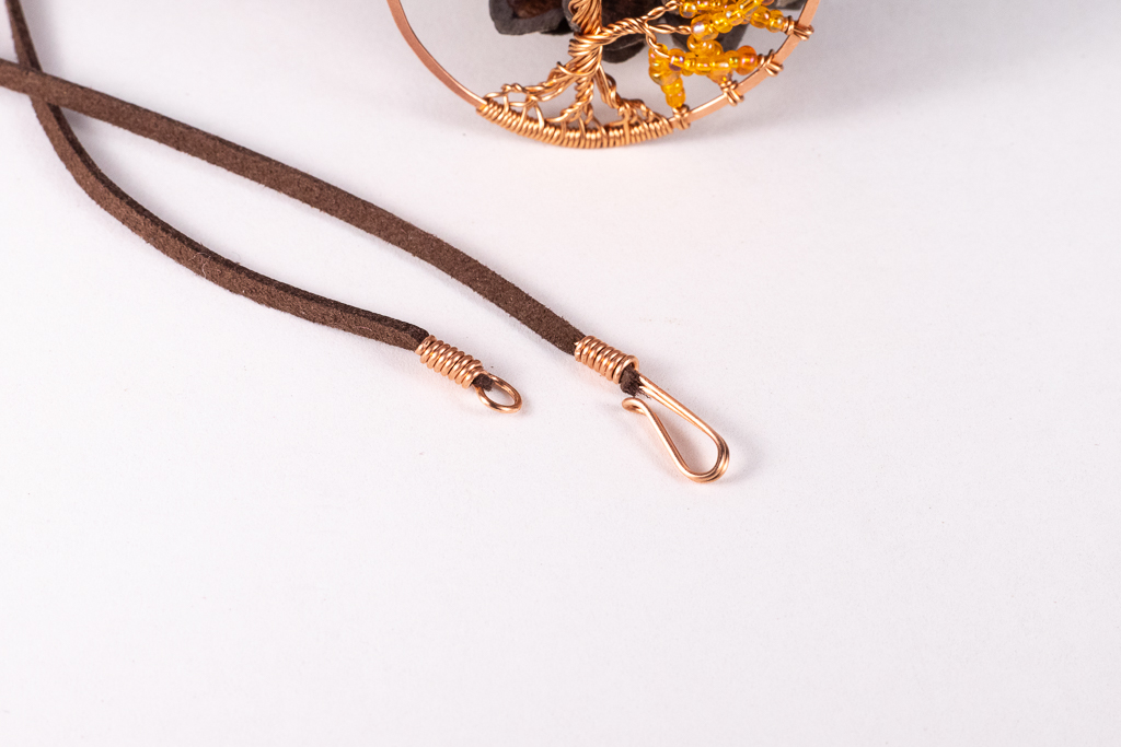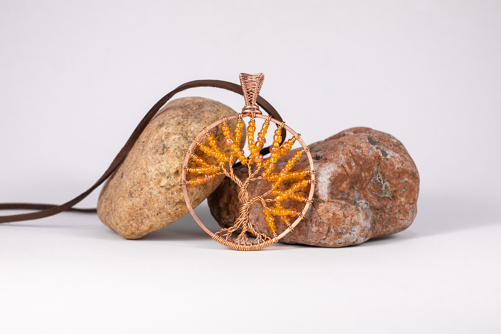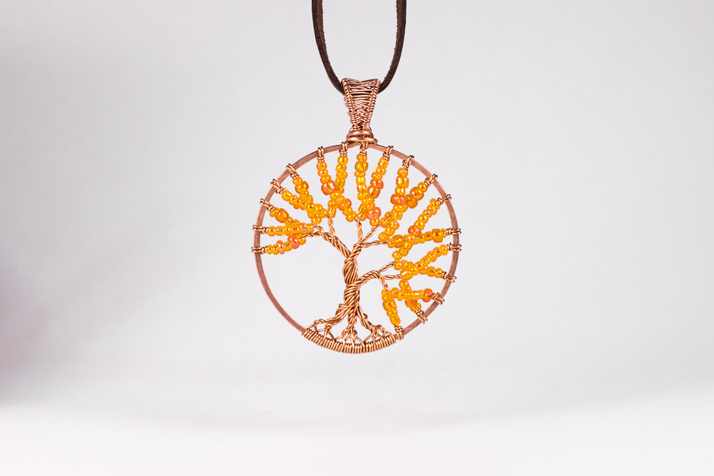 Käsintehty riipus kuparilangasta, koristeltu oransseilla lasihelmillä.