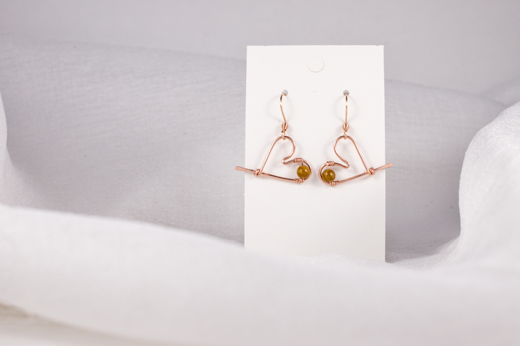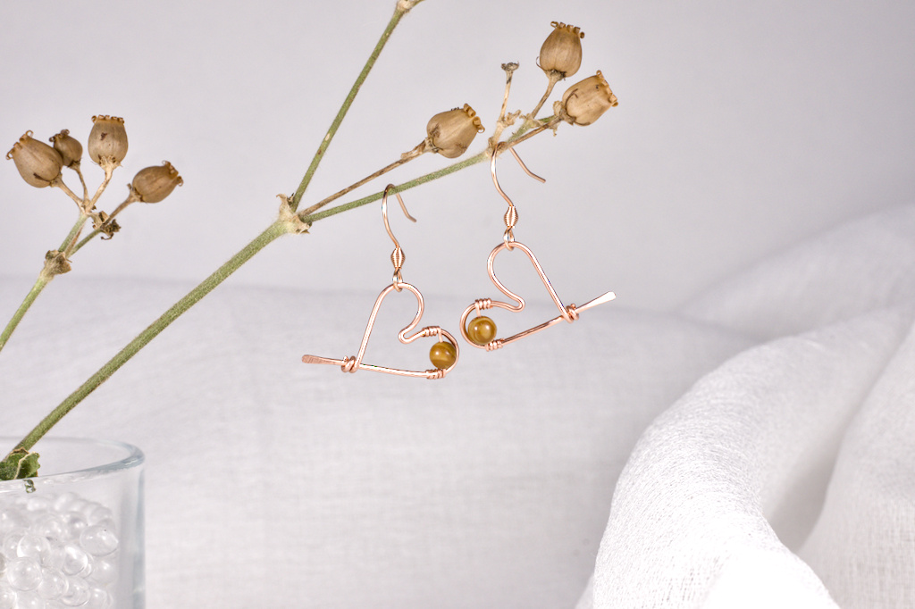 Käsintehdyt korvakorut kuparilangasta, koristeltu puukivihelmillä.