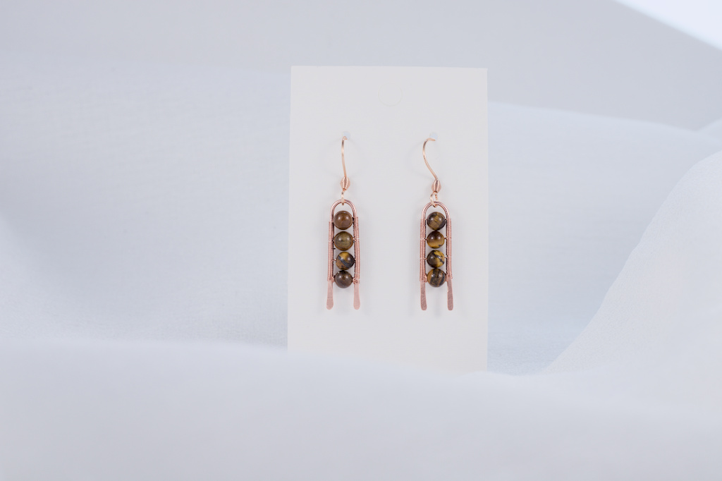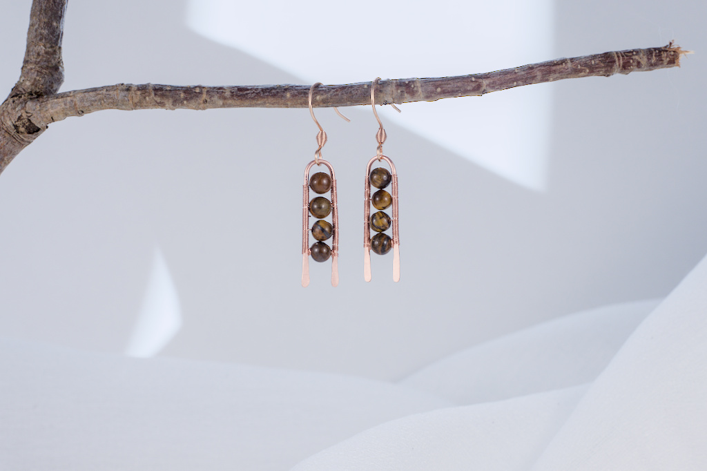 Käsintehdyt korvakorut kuparilangasta, koristeltu tiikerinsilma-helmillä.